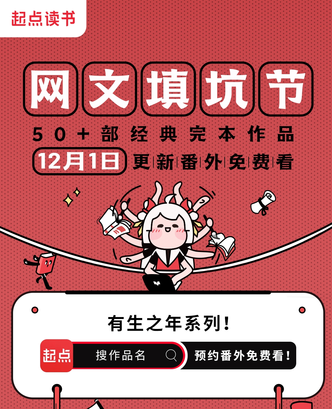 11月25日,阅文集团旗下起点读书App“网文填坑节”活动首批书单出炉。《斗罗大陆》《盗墓笔记》《凡人修仙传》《诡秘之主》《全职高手》《诛仙》等五十余部经典完结作品即将于12月1日在起点读书再更新番外,全站用户免费阅读。