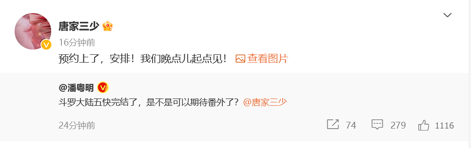11月25日上午,爱潜水的乌贼、蝴蝶蓝、南派三叔、唐家三少、萧鼎等网文大神陆续在社交媒体回应,宣布将为自己的完结作品加更番外,满足广大读者的愿望。面对潘粤明的许愿:“斗罗大陆五快完结了,是不是可以期待番外了?”,唐家三少回应称:“预约上了,安排!我们晚点儿起点见!”