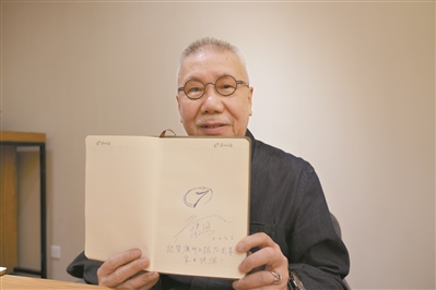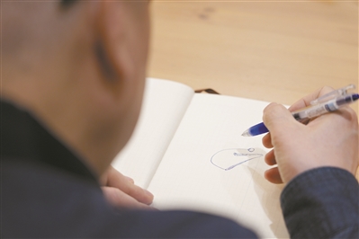 靳埭强在采访本上画出广州日报标志。