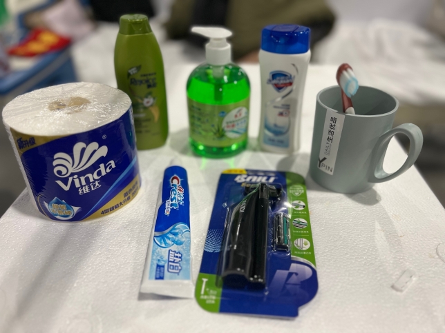 随着工作人员的指引,林昊旻和同行的伙伴步行前往指定的床位,领取的全新的被子、床单、枕头等物资。同时,林昊旻还收到一个爱心大礼包:沐浴露、剃须刀、眼罩、耳塞……“工作人员很用心,细节做得很好。”林昊旻说,爱心大礼包区分男士使用和女士使用,在男士的大礼包中会有剃须刀,而女士的大礼包则有女性专用物品。另外,琶洲方舱医院配备了专业的医护团队和志愿者队伍,“舱友”们生活各方面得到了照顾。