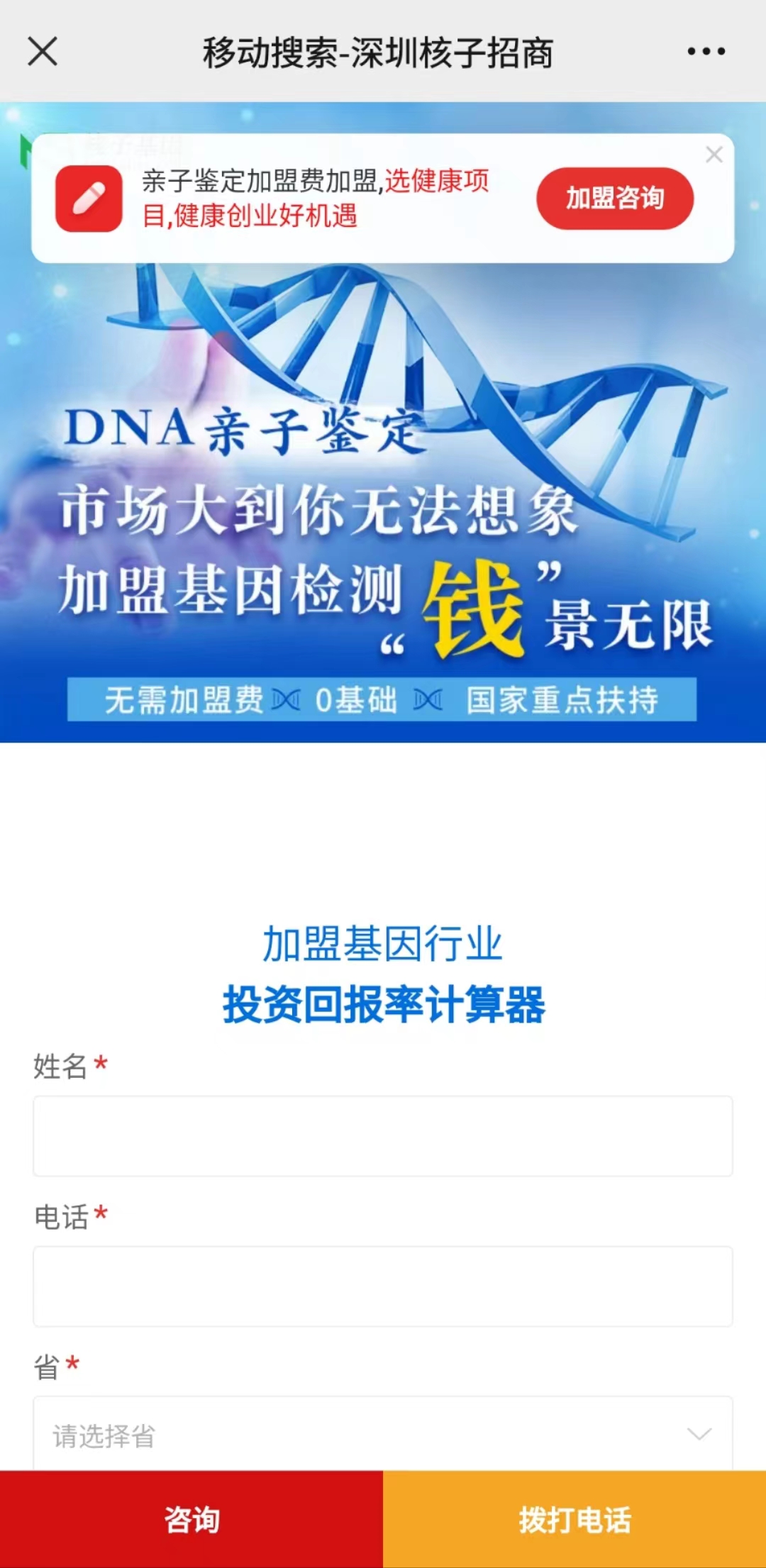 “DNA亲子鉴定,市场大到你无法想象,加盟基因检测,‘钱’景无限”。“核子基因集团”微信公众号“招商中心”页面显示,亲子鉴定基因检测正在全国招商中。只需填写姓名、电话、所在地区等信息,就能计算加盟基因行业的投资回报率,并抢加盟名额。