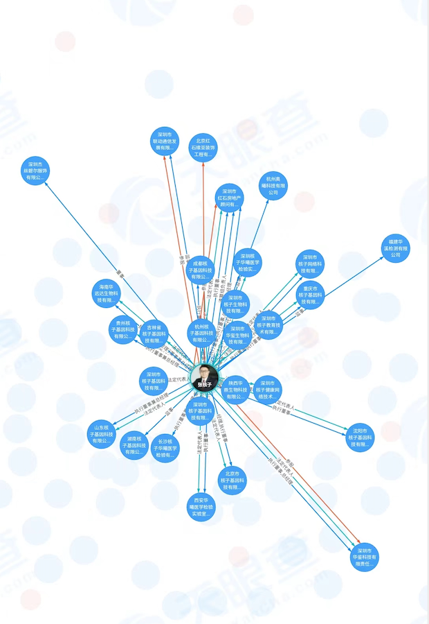 核子基因的实际控制人张核子名下关联公司有30家,其中16家为开业、存续状态,包括深圳市核子生物科技有限公司、西安华曦医学检验实验室有限公司、广东华曦法医物证司法鉴定所等,版图涉及基因科技、生物科技、司法鉴定等。