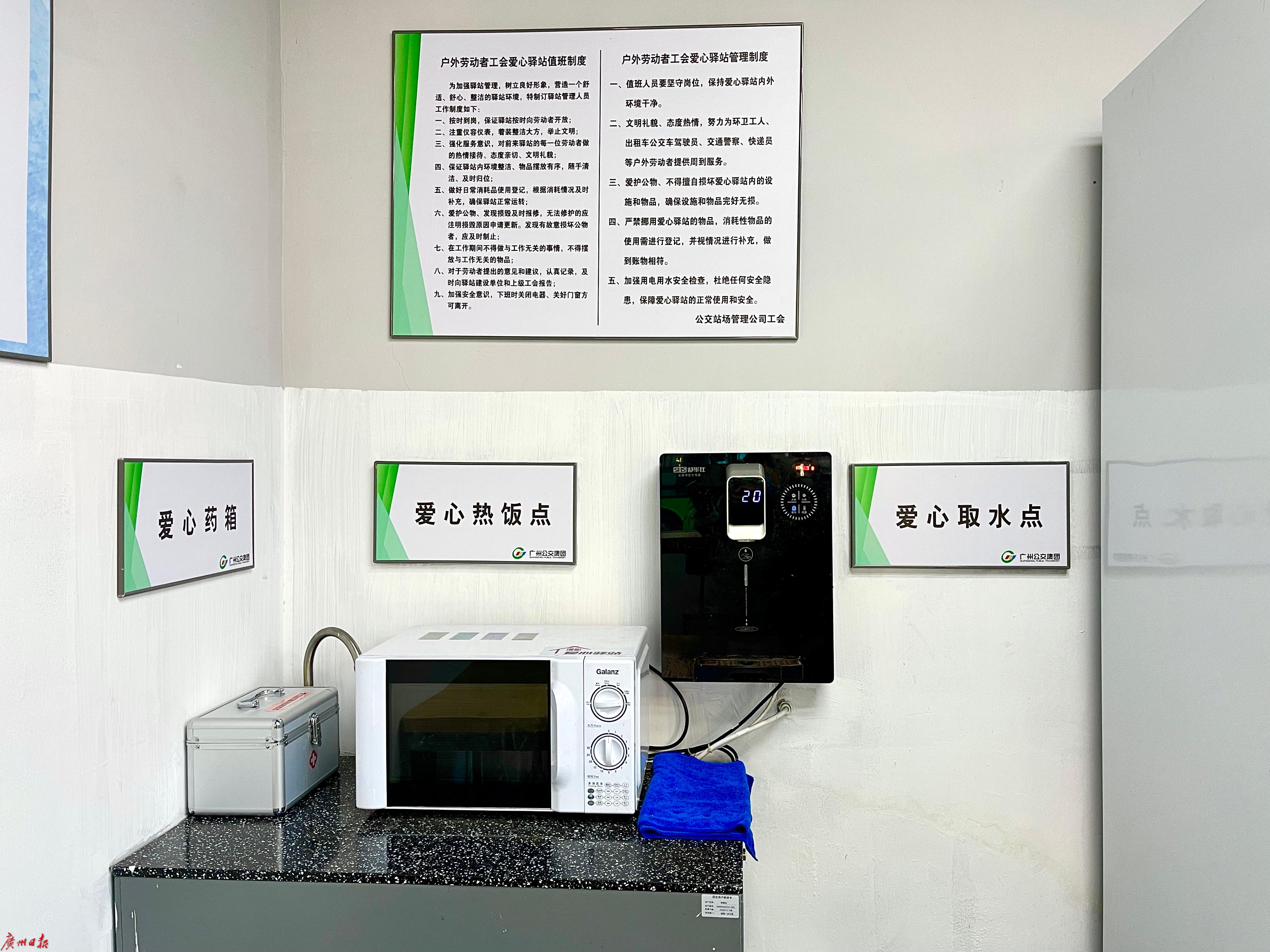 此外,公交站场管理公司在各重点公交站场内以“党员先锋岗”“青年文明号”、“学雷锋”志愿服务岗及爱心驿站等,作为“暖冬”服务载体,为过往市民、坚守岗位的户外劳动者提供热水器、热饭盒、微波炉、药箱等,为市民提供安全、便捷、温馨的出行服务。记者获悉,在天河客运站、 白云文化广场 、东山(龟岗)公交站场等7个公交站场均设有爱心驿站。
