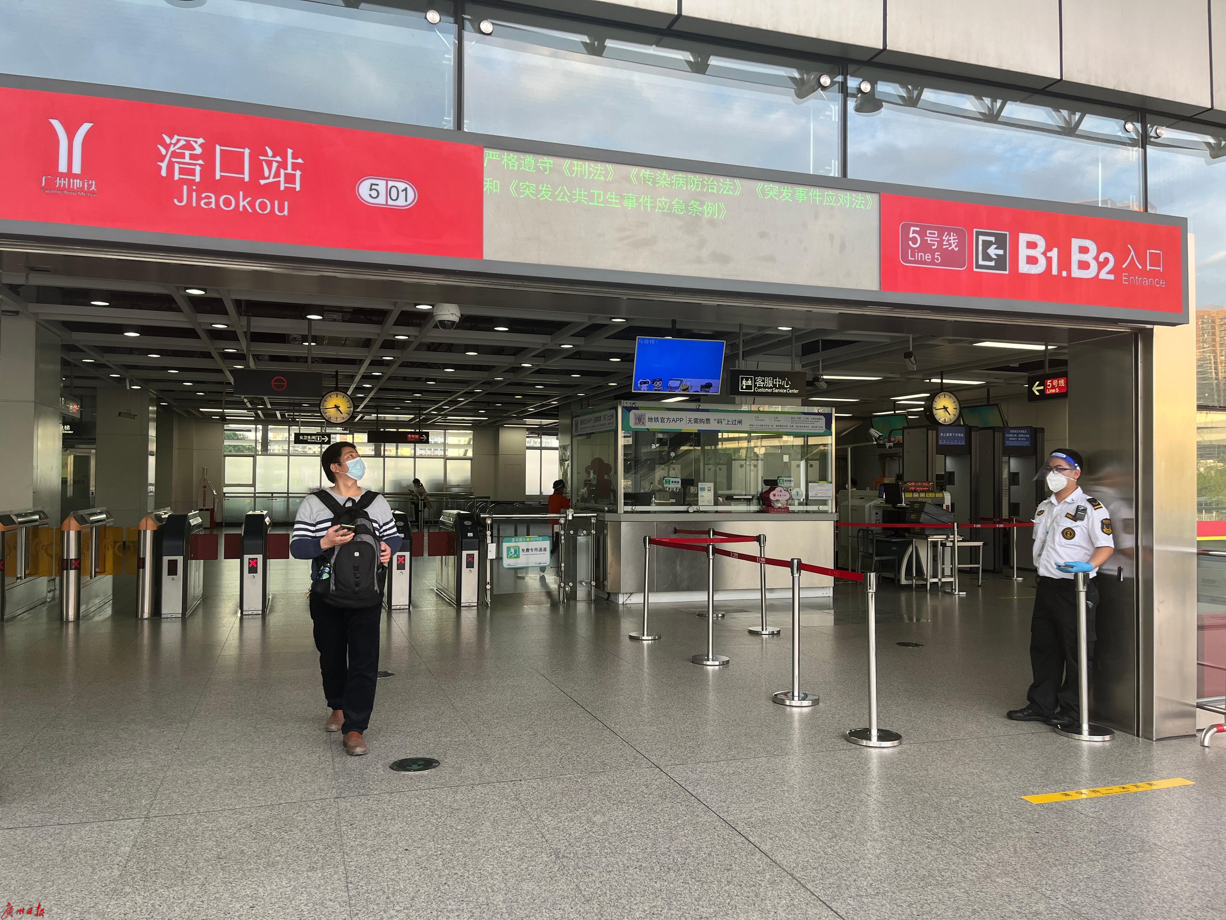 随后,记者抵达地铁5号线滘口站,以同样的方式进站安检。当记者的背包过地铁安检机时,发出警报声,安检工作人员立即要求对两瓶饮料进行检测,甚至还要求查看包中的充电宝。记者在地铁6号线河沙站也遇到了类似的情况。