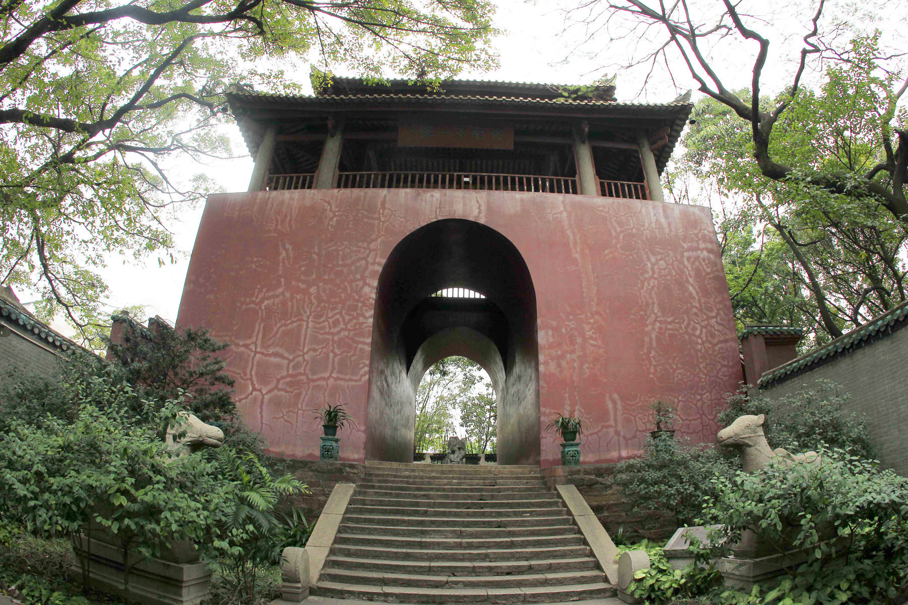 沿着建筑两侧的阶梯拾级而上,木构方亭内高悬着一口铜钟。这是广东现存最大的古代青铜钟,有万斤之重,钟底下有方形竖井,直通一楼的门洞,形成一个巨大的共鸣器,据说可“声闻十里”。当时的人们只有在遇着火警之类等非常事故才撞击鸣钟,无事禁止撞钟,所以这口古钟又被称为“禁钟”,岭南第一楼因此又被呼作“禁钟楼”。