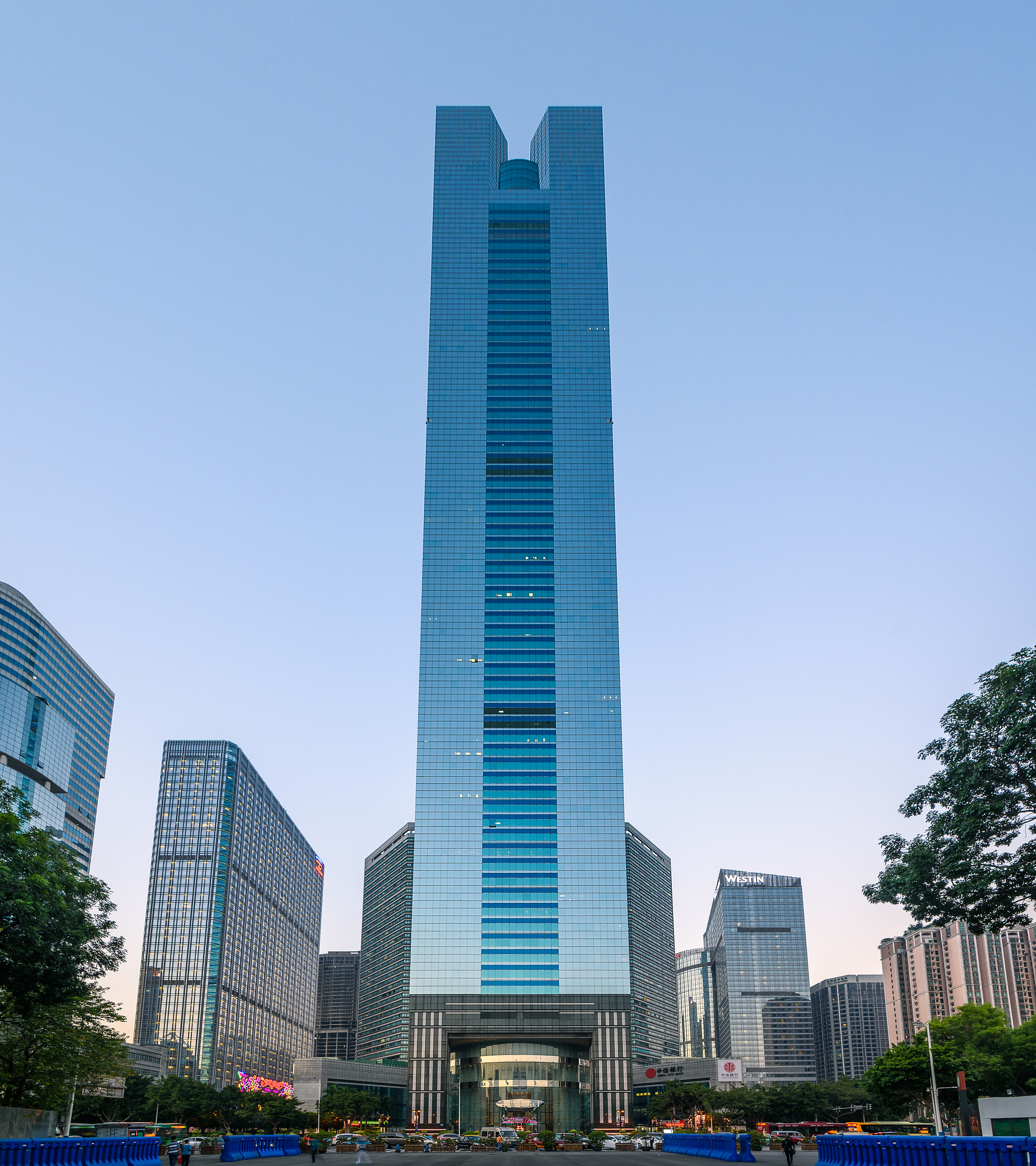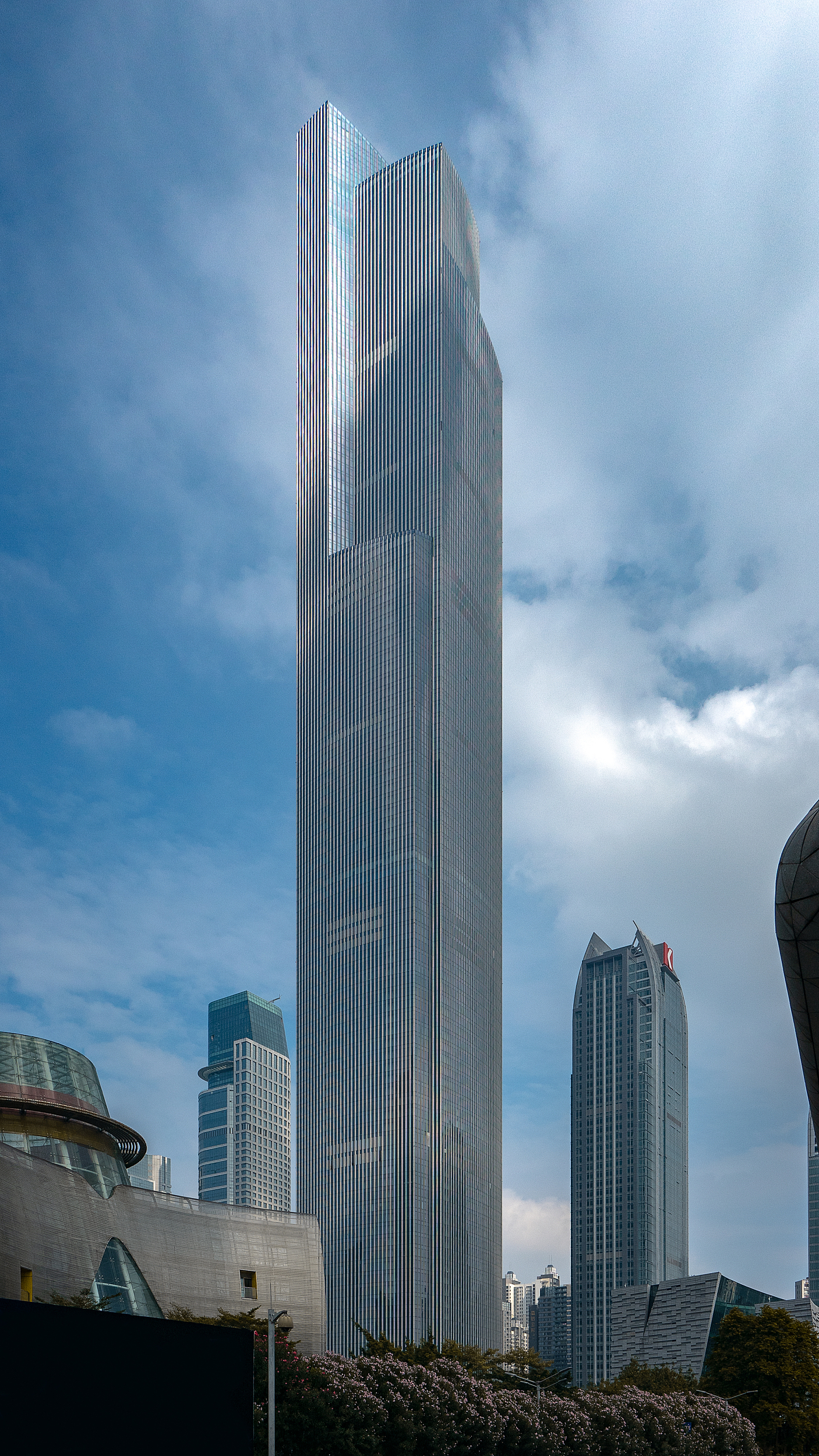 在珠江另一侧,位于中信广场正南方不到5公里的广州国际金融中心(简称“广州西塔”)与广州塔隔江对望,2012年投入使用。这标志着珠江新城首座超高层商业综合体和代表性建筑正式亮相,也意味着珠江新城核心商务区、广州区域金融中心和广州国家中心城市建设迈上一个新台阶。“广州西塔”主塔楼高440.75米,地上连地下共107层“我们将西塔原设计平面旋转一个角度,变成‘两面’指向珠江。” 全国工程勘察设计大师、华南理工大学建筑设计研究院院长倪阳表示,这一旋转不仅使立面变得富有立体感和层次感,还为西塔增加了三分之一、近9万多平方米的向江面使用面积,为西塔提升了20多亿元的价值。