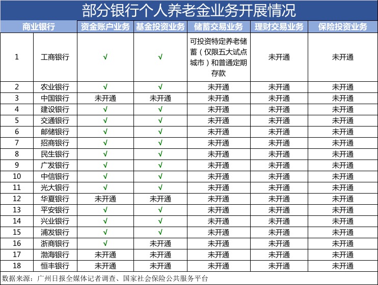 记者调查发现,截至11月29日,23家银行中,中国银行、华夏银行、渤海银行、恒丰银行、上海银行、江苏银行和南京银行未启动开户业务,尚处于预约阶段。华夏银行广州分行告诉记者,该行个人养老金业务管理系统开发已接近尾声,目前正在进行最后阶段测试,即将开放业务办理。