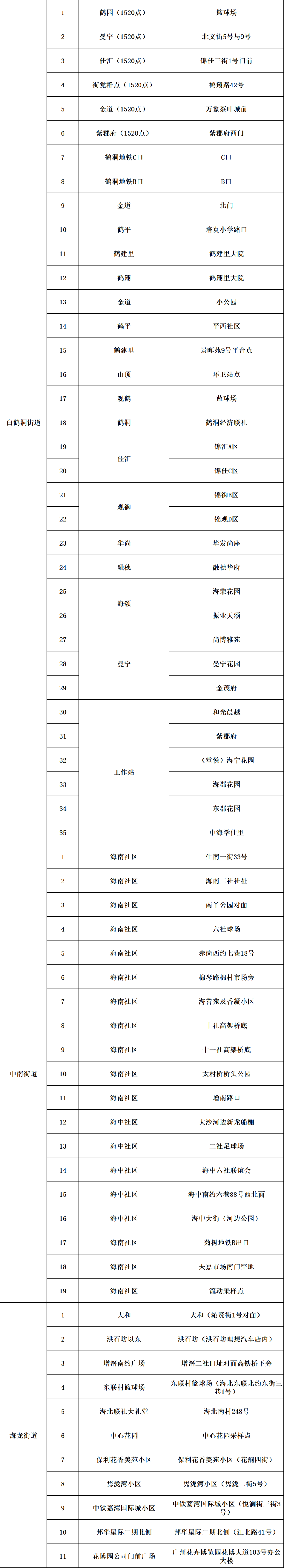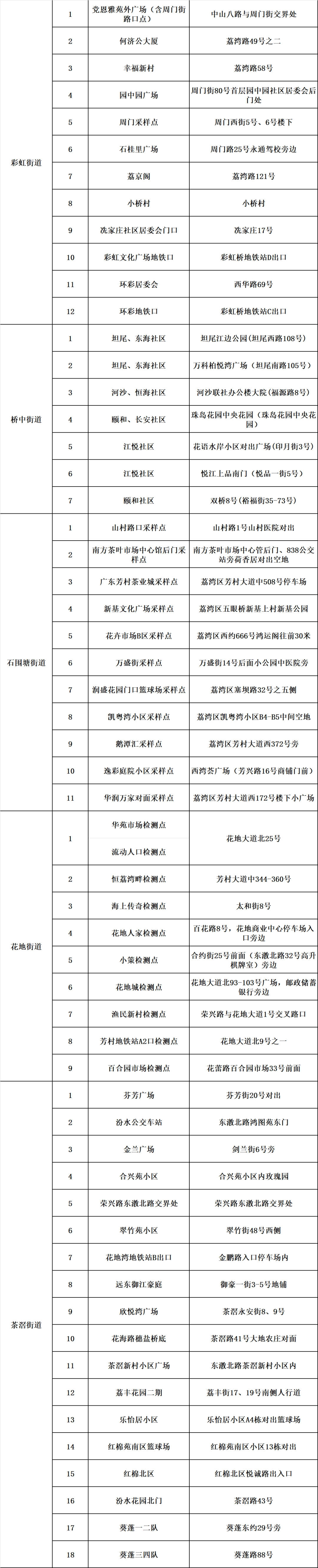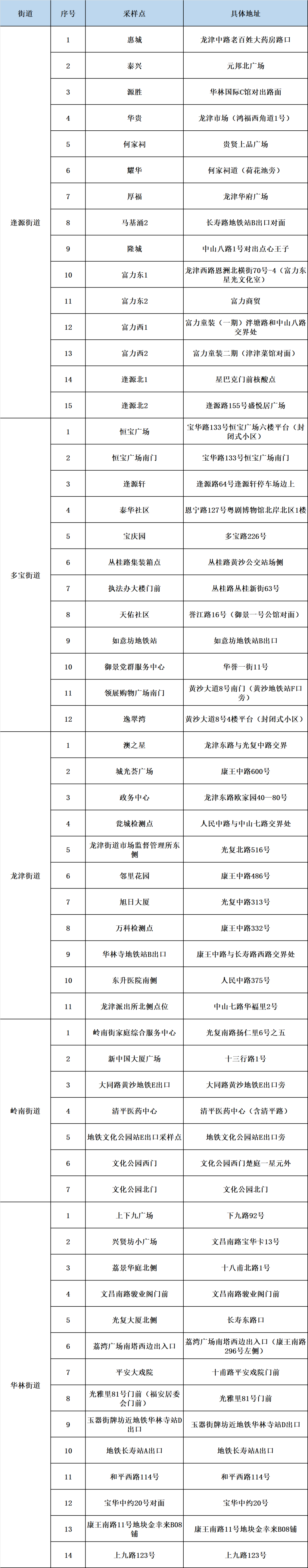 根据最新疫情防控形势,为切实保障广大市民生命安全和身体健康,2022年11月30日(星期三)8时开始,逢源、多宝、龙津、岭南、华林、彩虹、桥中、石围塘、花地、茶滘、白鹤洞、中南、海龙等13条街道开展核酸检测“应检尽检”工作,请以上13条街道的市民朋友(含外来人员)到就近的采样点(详见附表)进行1次核酸检测。有关注意事项如下: