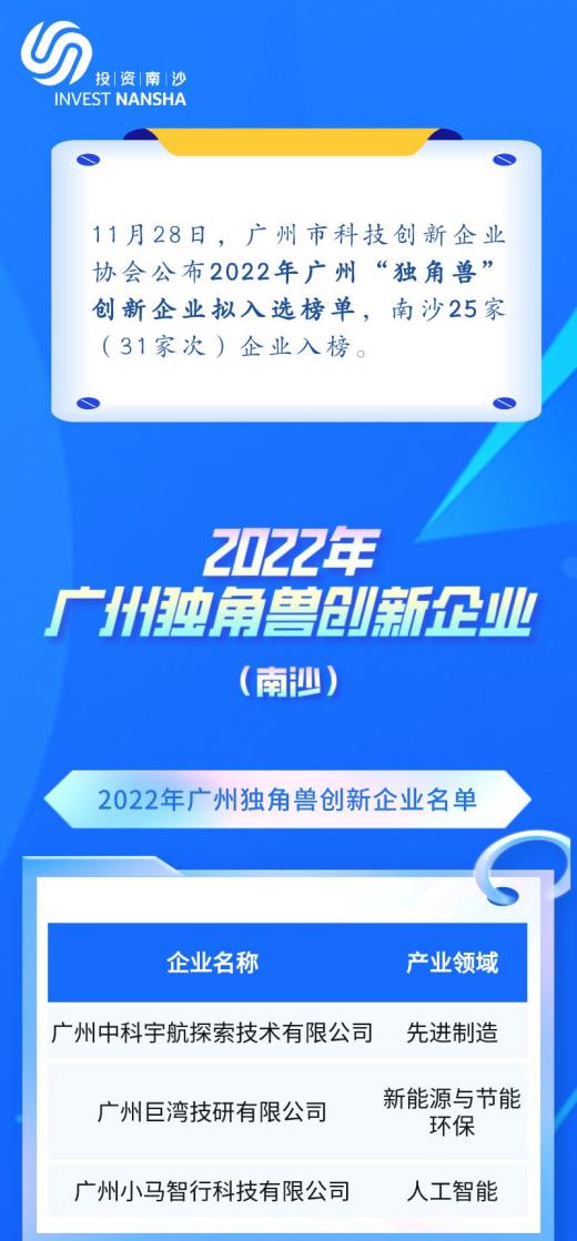 近日,2022年广州“独角兽”创新企业拟入选榜单公示, 南沙企业上榜25家(31家次)!今年,中科宇航、巨湾技研以及小马智行拟入选“广州独角兽创新企业”榜单,还有包括捷盟智能、因明生物、宸境科技等在内的南沙企业拟入选“广州未来独角兽创新企业”“广州种子独角兽企业”“广州高精尖企业”榜单。拟上榜企业行业涵盖先进制造、新能源与节能、人工智能、生物医药等多个领域。南沙企业上榜名单如下: