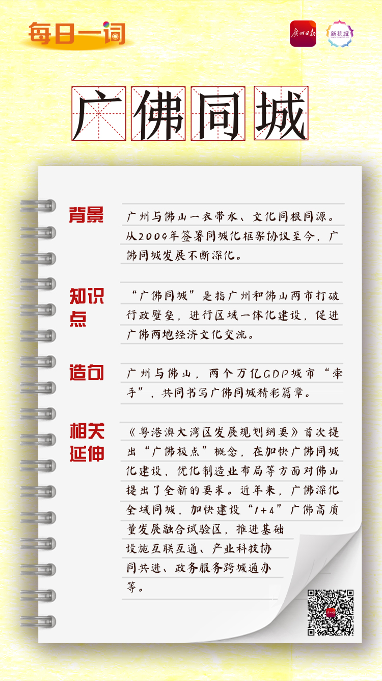 “广佛同城”是指广州和佛山两市打破行政壁垒,进行区域一体化建设,促进广佛两地经济文化交流。广州与佛山一衣带水、文化同根同源。从2009年签署同城化框架协议至今,广佛同城发展不断深化。