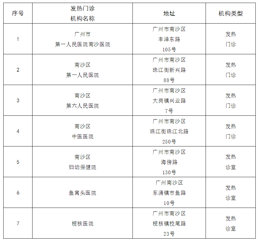 若出现发热症状(体温≥ 37.3℃)根据防疫防控要求,如果就诊机构未设置发热门诊(诊室),便不得接诊发热(体温≥ 37.3℃)病人。目前,南沙区有7家医院开设发热门诊(诊室)。如有发热等症状,请您立刻就近到以下医疗机构就诊: