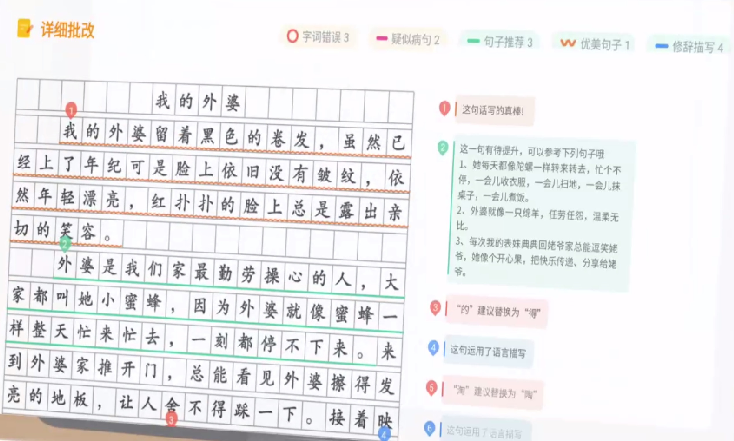记者采访发现,AI老师竟然还可以按照考试标准批改作文。今年四年级的鹏鹏语文,尤其是作文不太好。他把老师留的作业《我的外婆》拍照上传,学习机首先将手写体的作文替换为看得更清楚的打印体,错字和“疑似病句”都标了出来,这是需要改的部分;优美句子和修辞描写也标记出来,让人看了有成就感;而最“厉害”的是AI给出的“提升提示”:鹏鹏写道:“外婆是我们家最勤劳操心的人,大家都叫她小蜜蜂,因为外婆就像蜜蜂一样整天忙来忙去,一刻都停不下来。”AI在这句旁边写道:“这一句有待提升,可参考下列句子哦:”她每天像陀螺一样转来转去忙个不停,一会收衣服,一会扫地,一会抹桌子,一会煮饭。“引导写作思路。