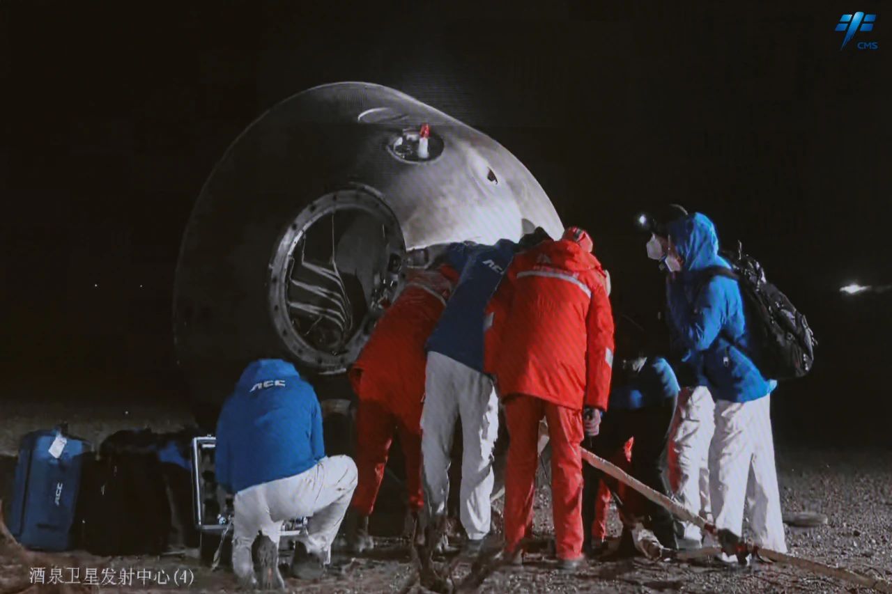 北京时间2022年12月4日20时09分,神舟十四号载人飞船返回舱在东风着陆场成功着陆,现场医监医保人员确认航天员陈冬、刘洋、蔡旭哲身体状态良好,神舟十四号载人飞行任务取得圆满成功。19时20分,北京航天飞行控制中心通过地面测控站发出返回指令,神舟十四号载人飞船轨道舱与返回舱成功分离。此后,飞船返回制动发动机点火,返回舱与推进舱分离。返回舱成功着陆后,担负搜救回收任务的搜救分队及时发现目标并抵达着陆现场。返回舱舱门打开后,医监医保人员确认航天员身体健康。