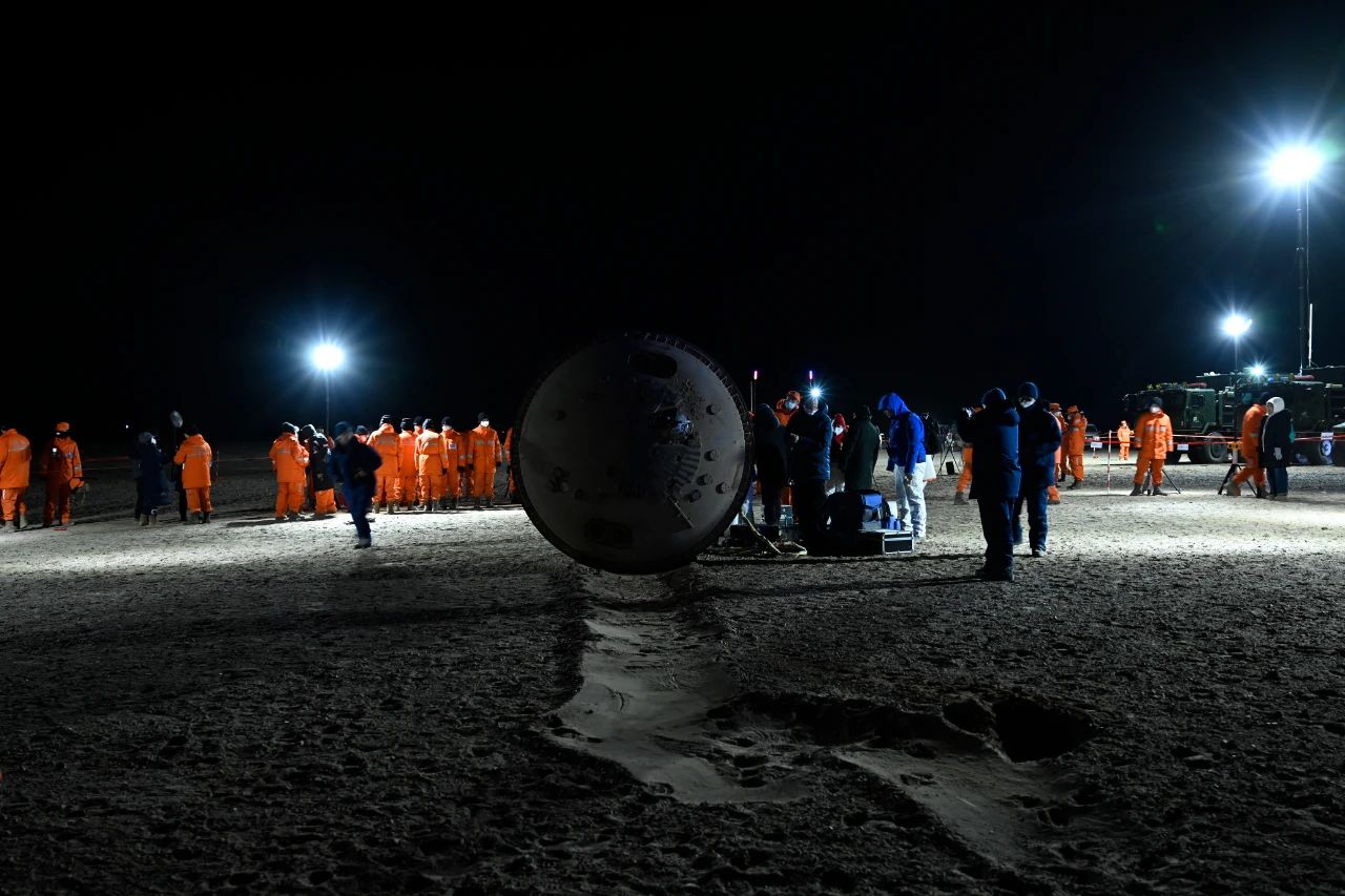 20时09分,随着“砰”的一声巨响,耀眼的橘黄色火焰从返回舱底部喷薄而出,缓冲发动机点火成功,返回舱稳稳降落在戈壁滩上。