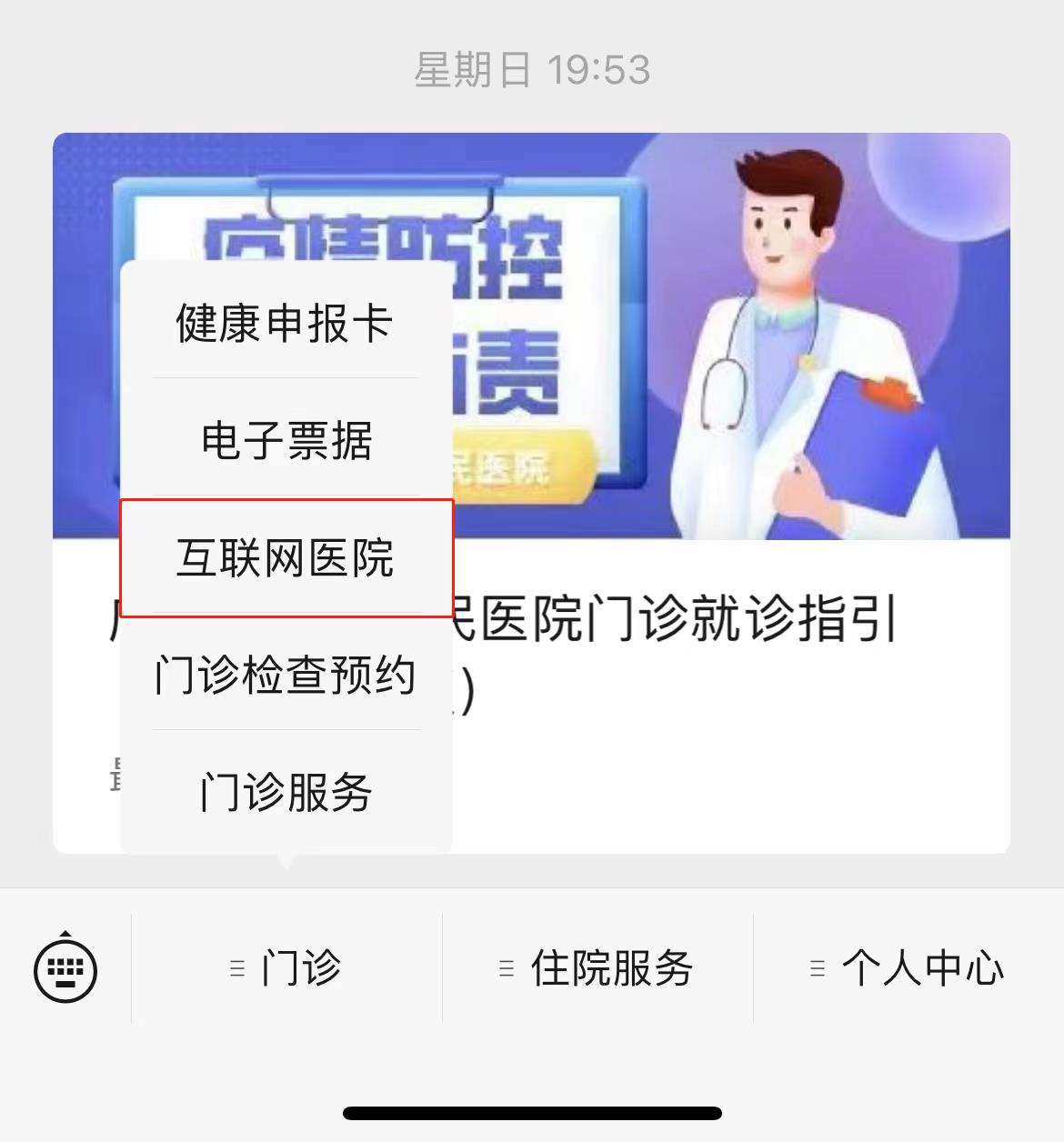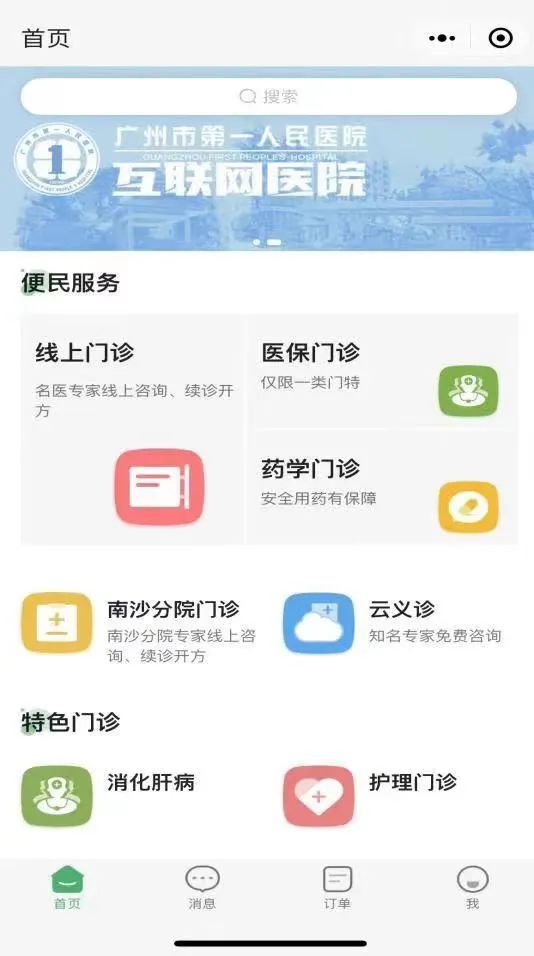 ①关注【广州市第一人民医院】微信服务号,点击门诊,进入【互联网医院】小程序,选择【线上门诊】或【医保门诊】;