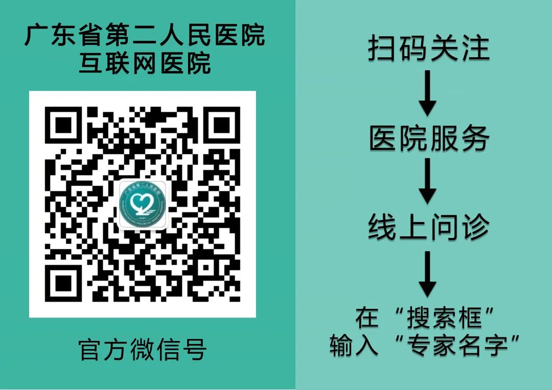 扫码关注“广东省第二人民医院”微信公众号,进入公众号点击菜单栏,点击“医院服务”-“线上问诊”-“在线问诊”-“选择医生”,可找到与线下同样的各临床专科医生,进行咨询、看诊、报告解读等就医服务。医生线上开具处方,通过处方流转平台,药品可以直接快递上门。