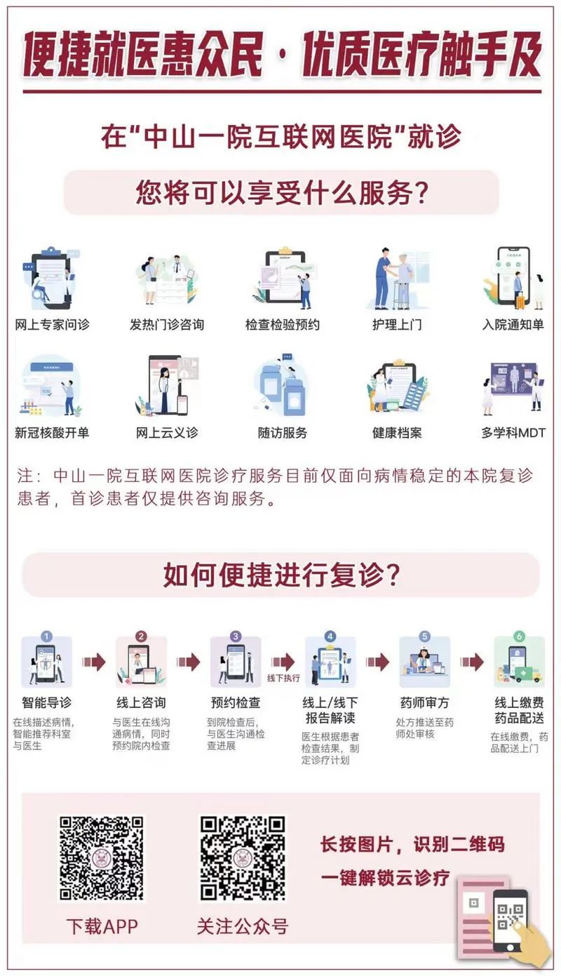 中山一院互联网医院【复诊慢病续方】功能让复诊患者不再跑医院、排长队、找医生,只需在手机上选择近三月内的过往处方,轻轻一点即可续药,药物将快递上门。