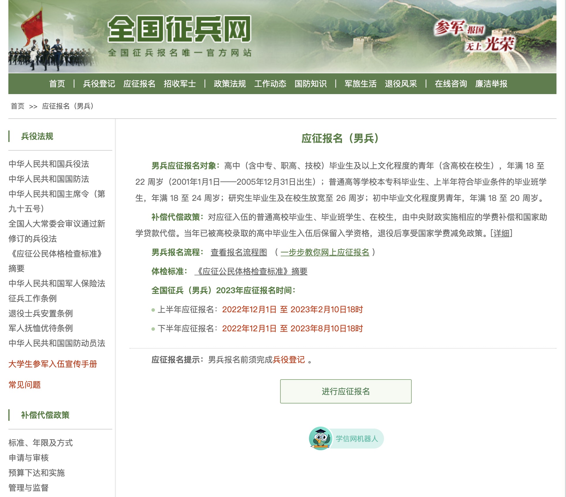 上半年应征报名时间为2022年12月1日至2023年2月10日18时。下半年应征报名时间为2022年12月1日 至 2023年8月10日18时。