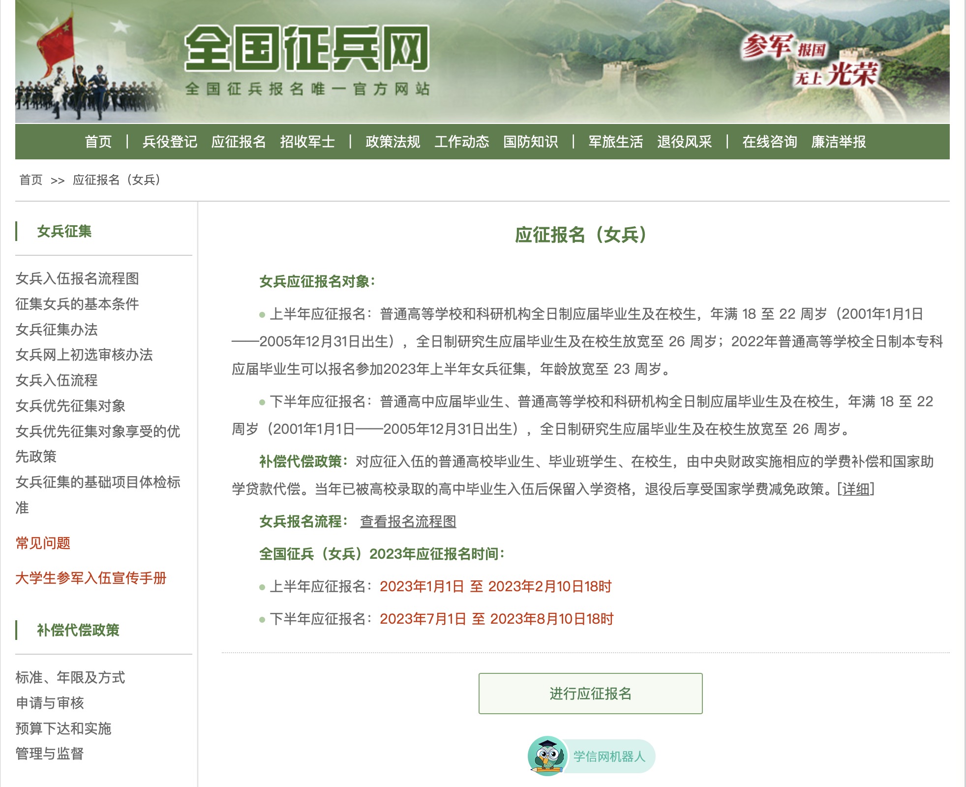 (1)上半年应征报名:普通高等学校和科研机构全日制应届毕业生及在校生,年满18至22周岁(2001年1月1日——2005年12月31日出生),全日制研究生应届毕业生及在校生放宽至26周岁;2022年普通高等学校全日制本专科应届毕业生可以报名参加2023年上半年女兵征集,年龄放宽至23周岁。