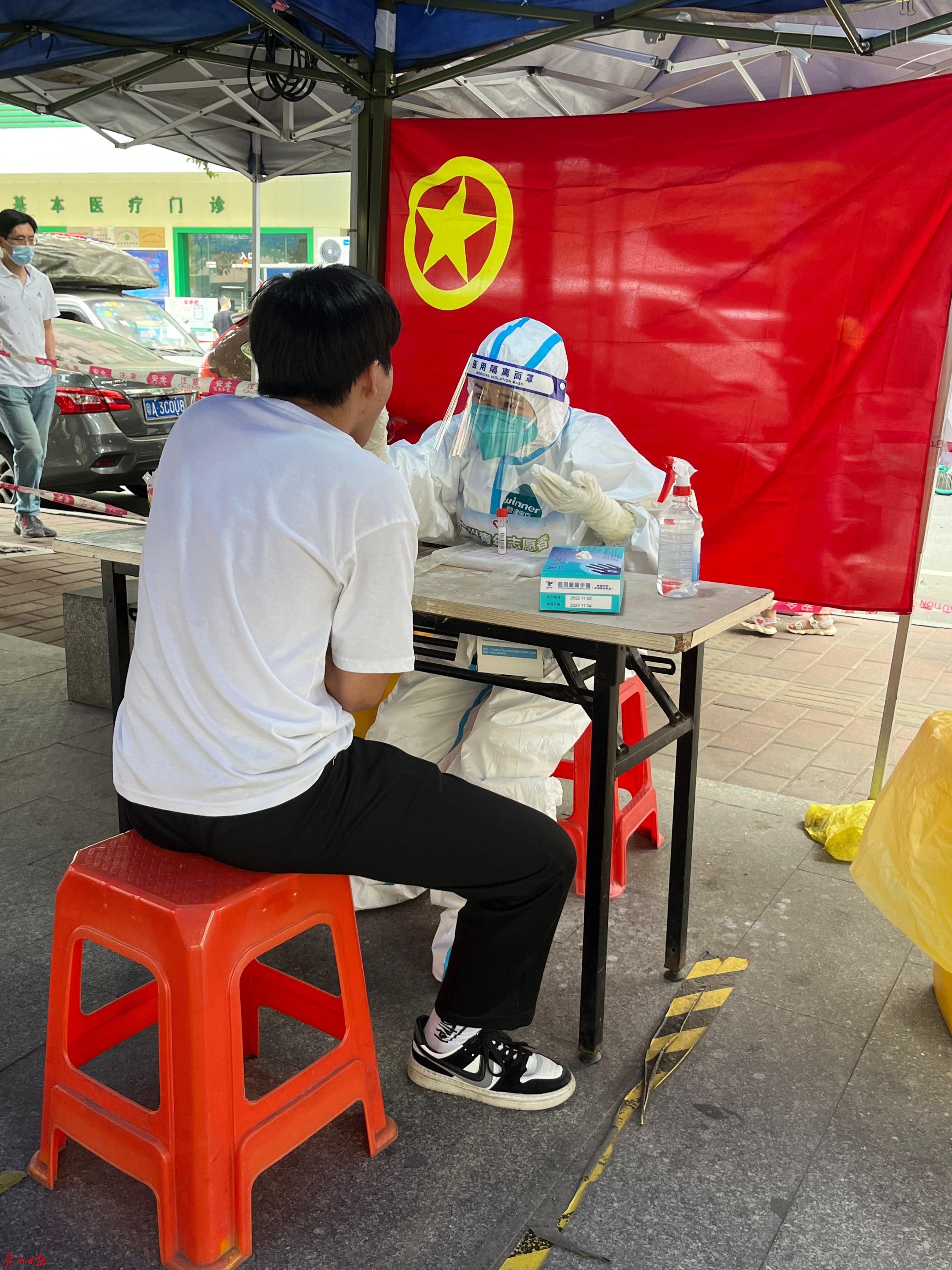 疫情發生後,擔任幼兒園行政後勤人員的張琰根據單位安排居家辦公。看到新聞里各個核酸採樣點人非常多,醫護人員非常忙,她就坐不住了。「現在女兒在家上網課,先生和我都居家辦公。我想既然有這個時間那就出去做志願者,為街坊們出一份力。」家裡人知道她要去做核酸採樣志願者,都表示很支持。上崗時,張琰幾乎一天都穿着厚厚的防護服,才十幾分鐘,汗水便從頭頂流到脖子,很快浸濕背部。