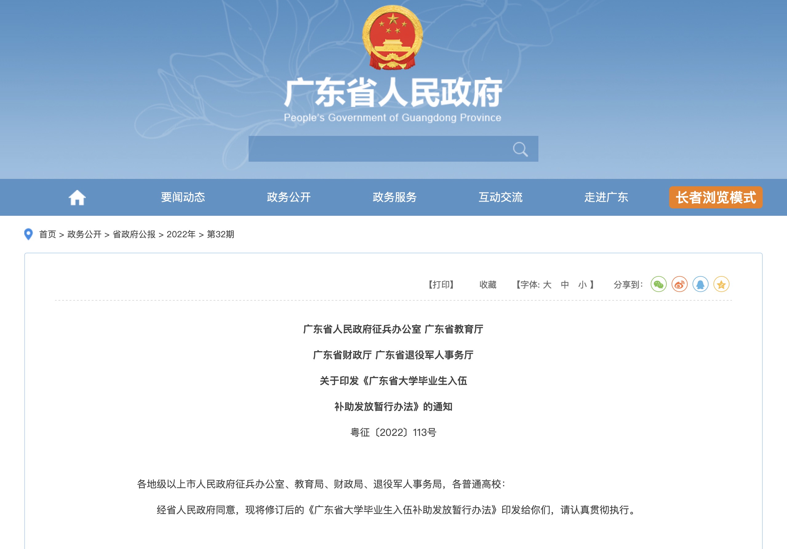 近日,广东省人民政府征兵办公室、广东省教育厅、广东省财政厅、广东省退役军人事务厅联合印发《广东省大学毕业生入伍补助发放暂行办法》(以下简称《暂行办法》)的通知。该《暂行办法》自印发之日施行,有效期3年。