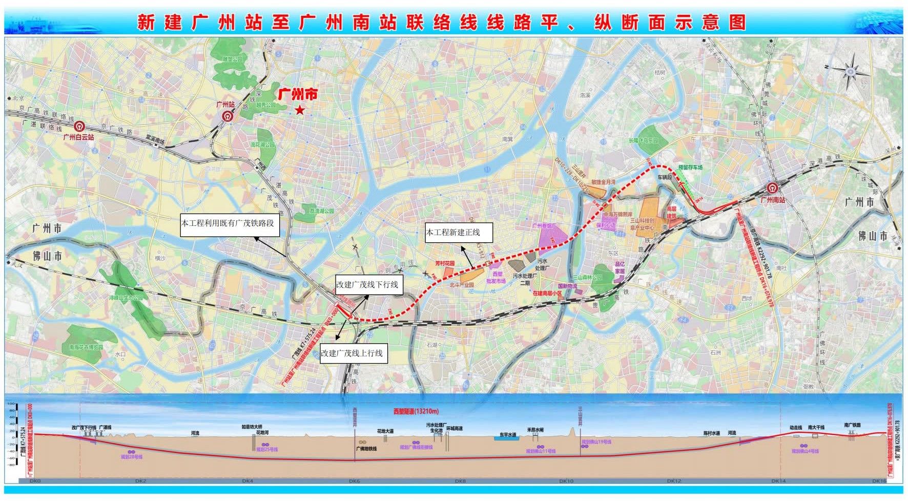 根据该公告,广州铁路枢纽新建广州站至广州南站联络线铁路位于广州、佛山两市毗邻地段,是粤港澳大湾区规划中完善广州枢纽的重要组成。线路北自广州站引出,利用广茂铁路至广佛两市交界广州市一侧的五眼桥线路所,经广州市荔湾区、佛山市南海区、广州市番禺区,后引入广州南站。