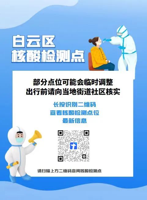 为满足市民朋友核酸检测的需求,白云区在辖内人口密集地、居民聚居区设置了核酸采样点,请市民朋友出行前向当地街道社区核实。