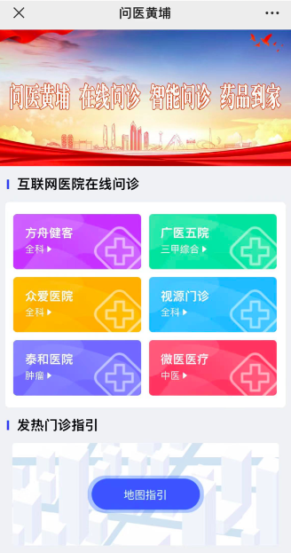 “问医黄埔”服务平台也于近日上线,该平台汇聚了辖内多家医疗服务机构,如方舟健客、广医五院、众爱医院、泰和医院、视源门诊等。平台分为互联网医院在线问诊、发热门诊指引、健康指引等板块。此外,居民还可以平台上找到发热门诊(诊室)地址,就近就医就诊。
