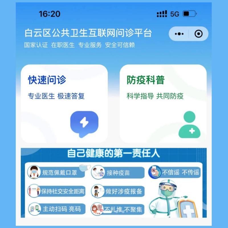 12月6日,“白云区公共卫生互联网问诊平台”小程序上线。该小程序设有“快速问诊”和“防疫科普”两个板块,市民在小程序中完成信息填写后,即可享受线上问诊、用药咨询、健康管理建议等足不出户的综合医疗服务。在“防疫科普”板块中,市民可以获取“个人防护指南”“防疫问答”等各种防疫知识。