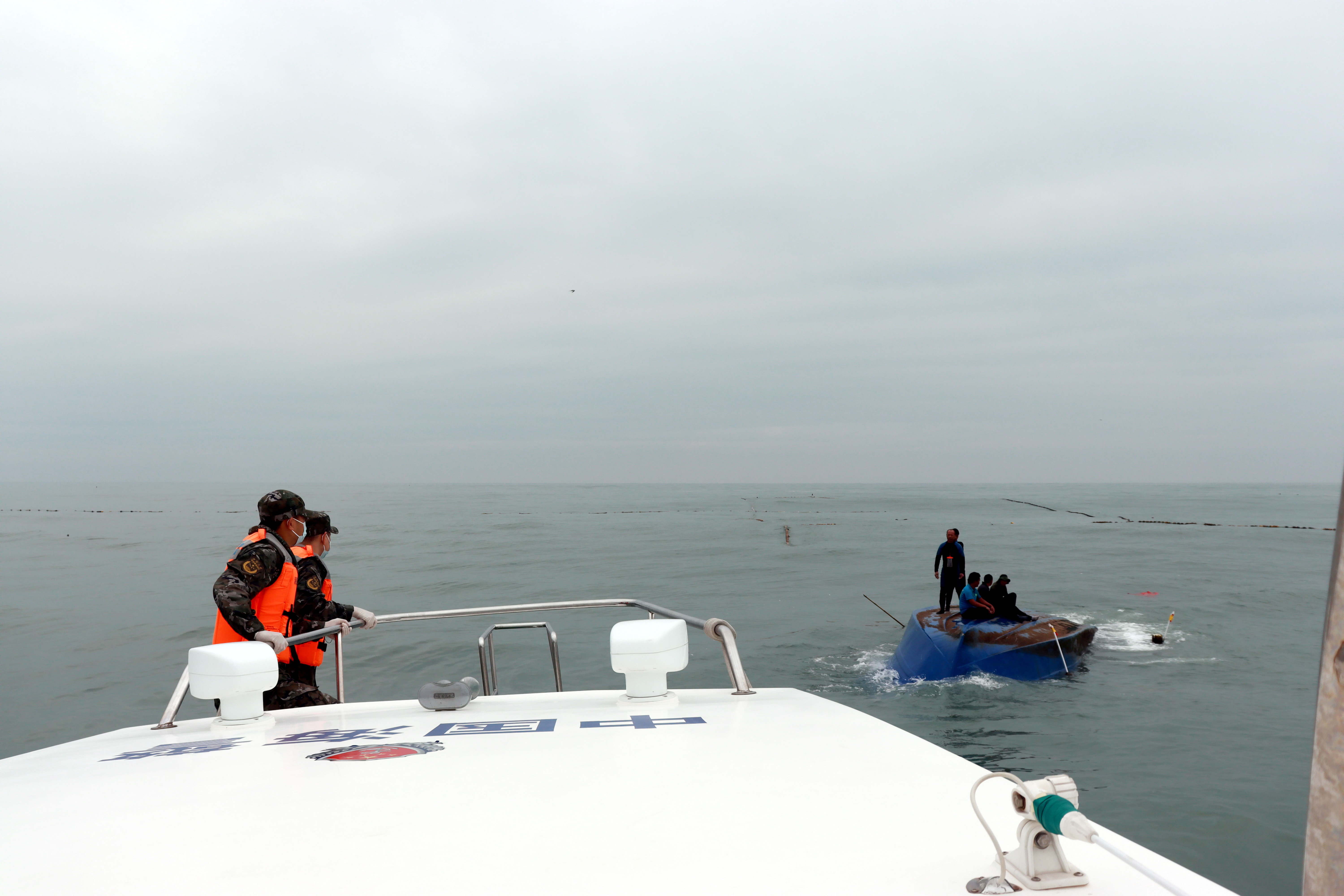 当时,受南下冷空气影响,海上涌浪较大,遇险船只已整体倾覆,船体倒扣在海面,摇晃剧烈,5名遇险渔民站立在倾覆船体上等待救援,情况十分危急。海警执法员克服恶劣海况带来的不利影响,利用娴熟的驾驶技能靠近遇险船只,成功将渔民救助至执法艇。