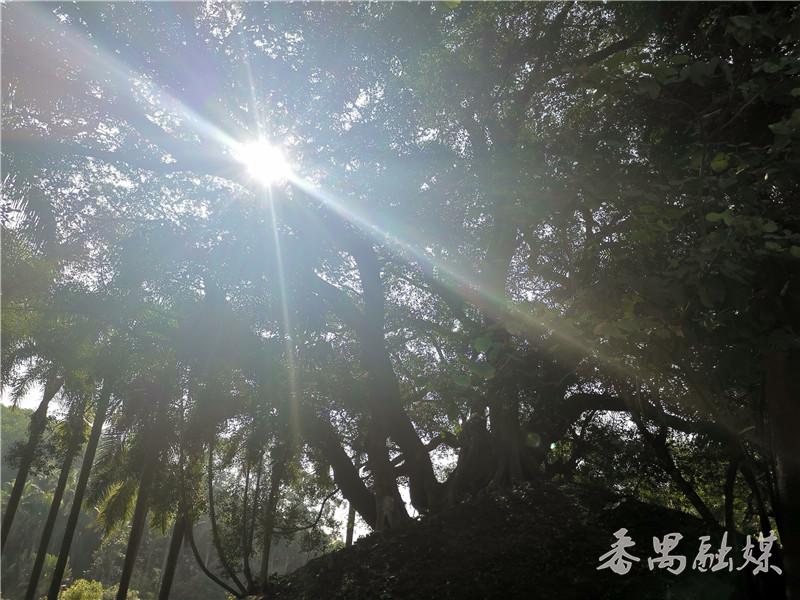 其时,正有园林工人为其中一棵古树切除周边的杂草,阳光透过高大的树冠倾泻下来。