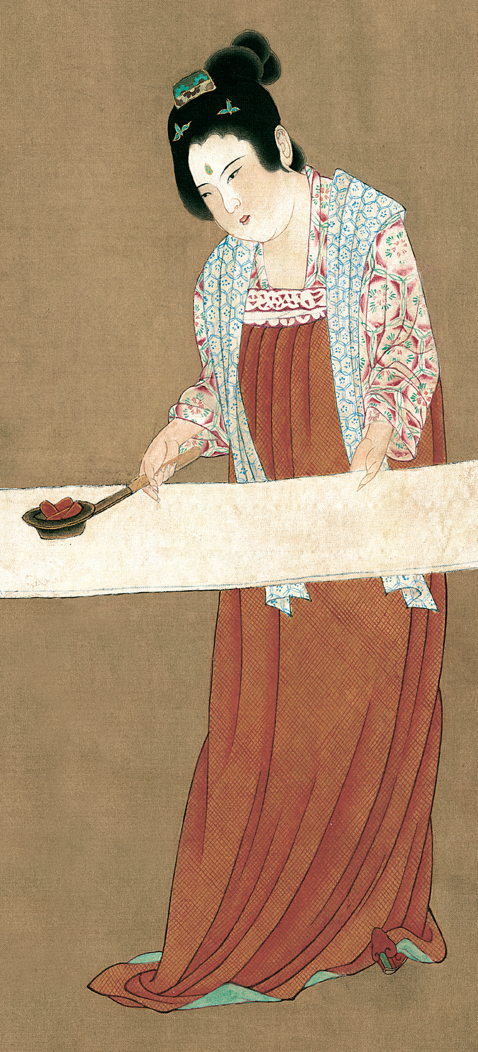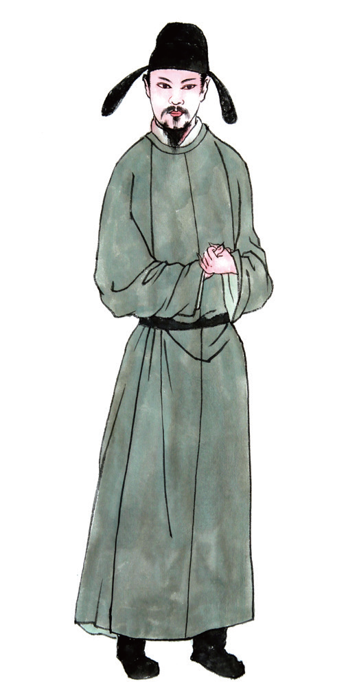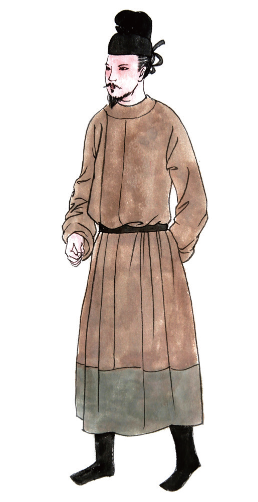唐代杜佑《通典》卷六十一记:“贞观四年制,三品以上服紫,四品、五品以上服绯,六品、七品以上绿,八品、九品以上青。”唐、宋的士人在圆领袍下摆贴一块布,称为襕袍。