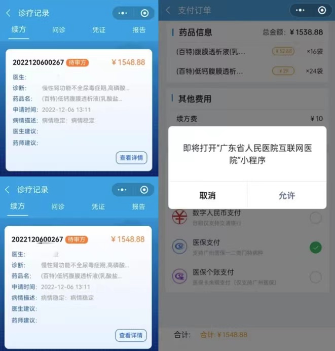 今年6月,广东省人民医院互联网医院正式上线腹透液,患者通过互联网医院即可实现挂号开单、送药上门。但当时政策规定互联网医院只能报销一类门特,报销比例低,由于经济困难,高女士还是到医院挂号、复诊、开药。