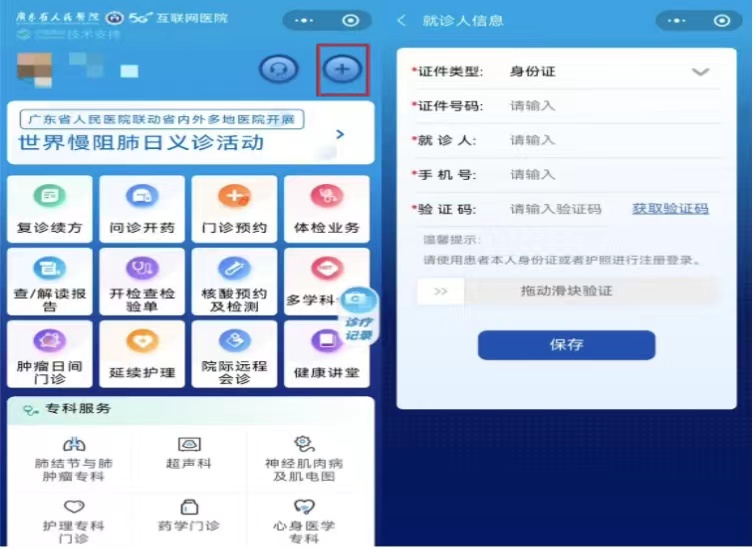 微信搜索“广东省人民医院5G互联网医院”,首次登录请在“添加就诊人”处完善信息。