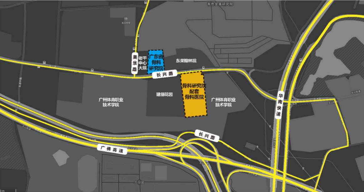 广东省骨科研究院项目分为南北院区2个地块,南北院区分别位于长兴路南北两侧,周边主要分布有建丽花园、东荣翰林苑、老干中心大院等居住小区,以及广州体育职业技术学院。项目地块北侧距华南植物园约1.5公里,南侧与华南农业大学相望。项目地块位于广州市天河区中部,广州环城高速以北、华南快速干线以西、广汕公路以南,交通区位较好。