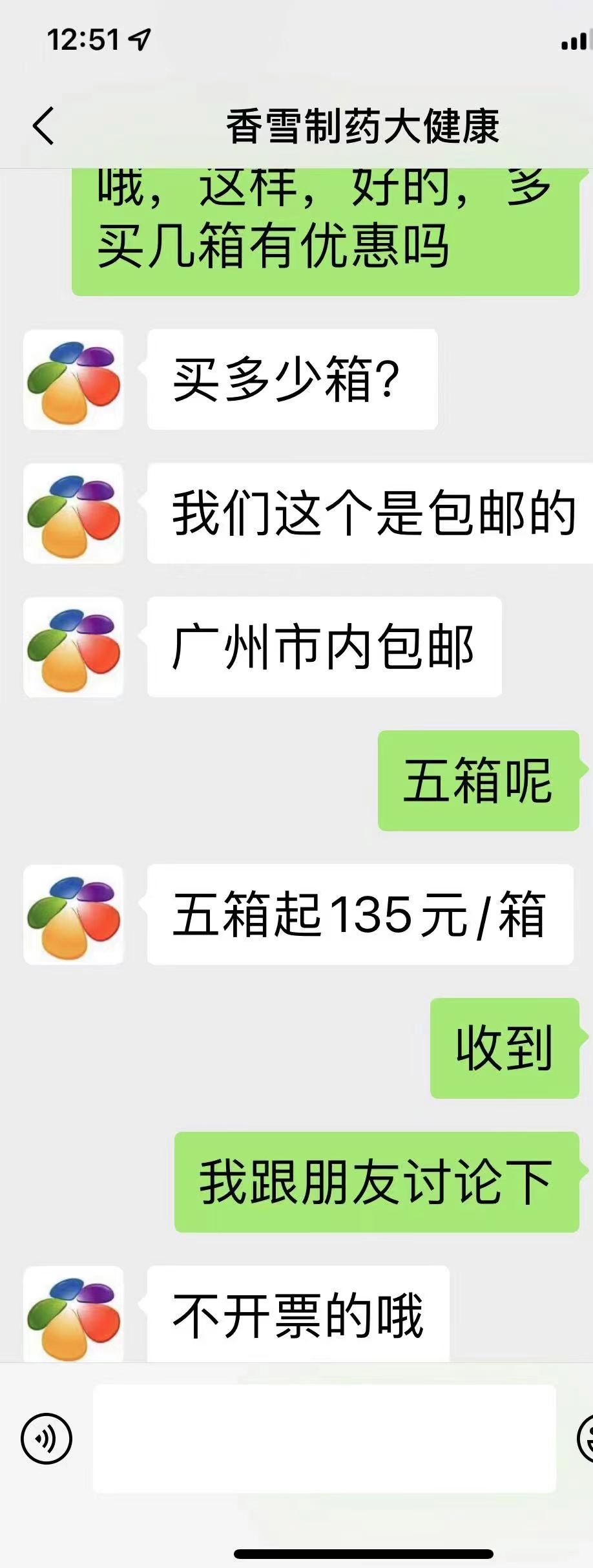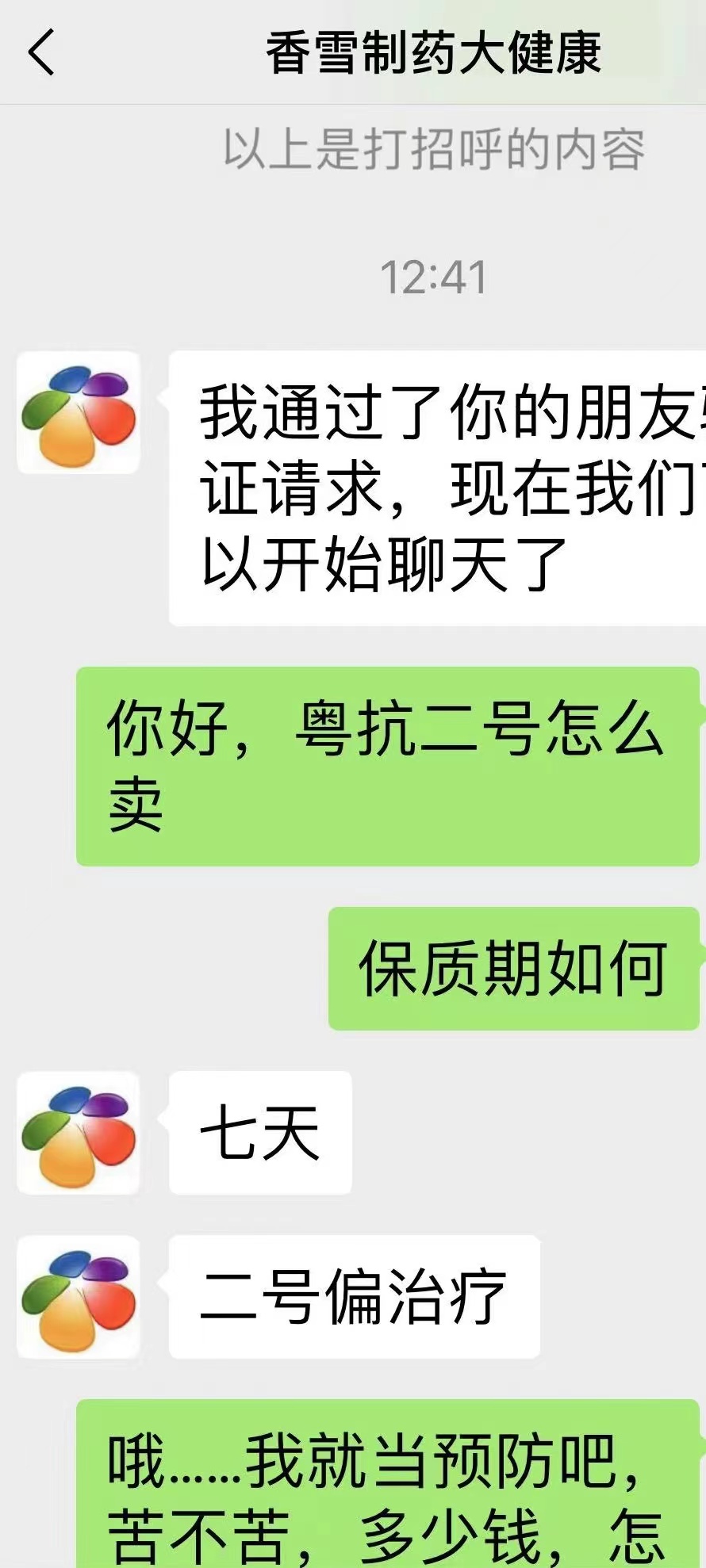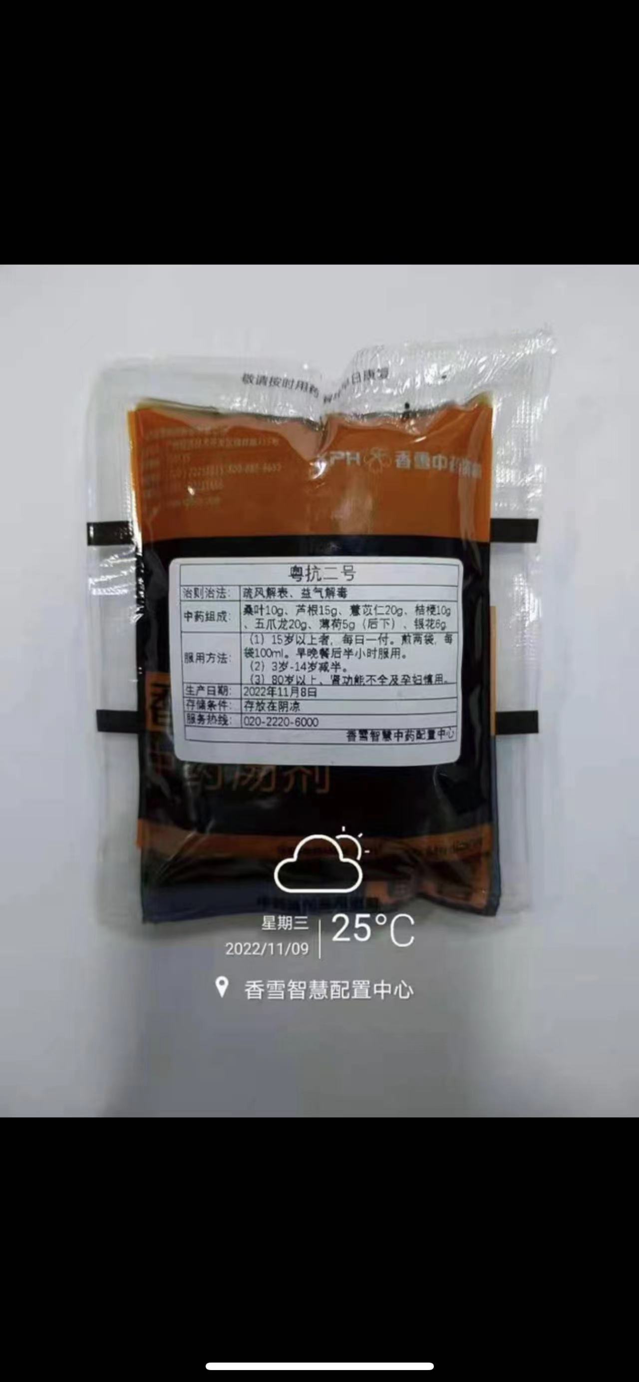 但就在12月9日,在香雪旗舰店推荐之下,微信名为香雪制药大健康的网店客服回复称:“广州市内包邮”“五箱起135元/箱”“不开票的哦”。她还表示:粤抗二号保质期七天,“二号偏治疗”。其介绍说,“二号是现煎煮的中药”,“一箱6剂12包共140元”。该客服回答巨细靡遗,其表示:“没现货,下单就煮”,“四点前下单下午发货,四点后下单是明天发”。据悉,该微信显示:客服在线时间8:30~20:00,所处位置在广东广州。