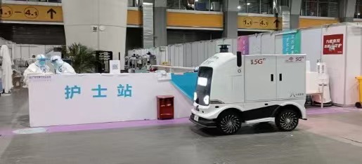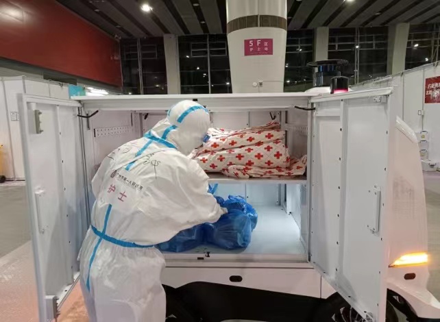 11月4日,广州市第一人民医院进驻琶洲A5方舱,舱内可容纳1638人,偌大的舱被分成了十二个病区,而护理人员只有181人,每个病区只能分配一名护士照料护理100-200名病人,毫无疑问为病人配餐、送物资、送药等成为护理最大的工作量,重复的走动不仅快速消耗护士的体力,还会因剧烈的活动容易导致出汗而汗湿浸润N95口罩和防护服,使防护效价大打折扣。有什么办法可以缓解这种工作压力呢?12月3日,“绝地3000H”无人车霸气“上岗”,通过路线规划和车辆调试后,可以在舱内进行各种物资配送,大大减轻了医护人员的工作量。