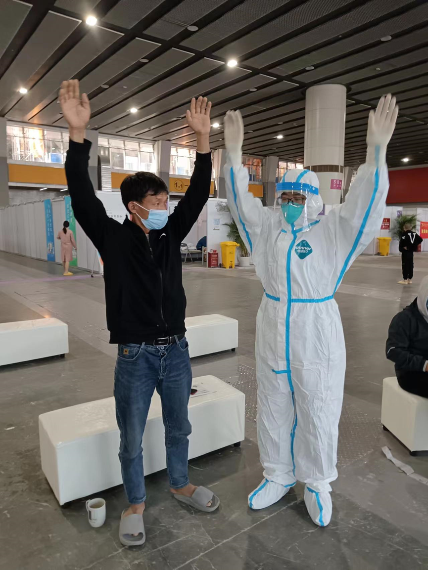 尹晓坤治疗师在方舱给新冠阳性患者做康复示范