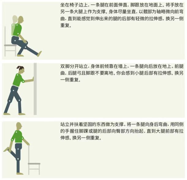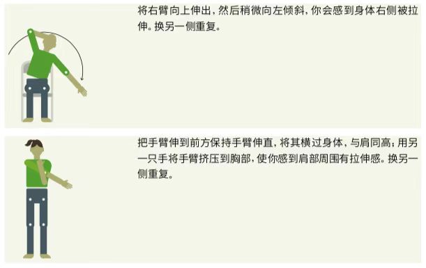 可以坐或站着时拉伸你的肌肉。每一次拉伸都应轻柔地进行,而且每一次都应保持15-20秒。