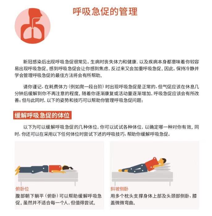 新冠感染后出现呼吸急促很常见。保持冷静并学会管理呼吸急促的最佳方法将会有所帮助,以下的姿势和技巧可以帮助你管理呼吸急促问题: