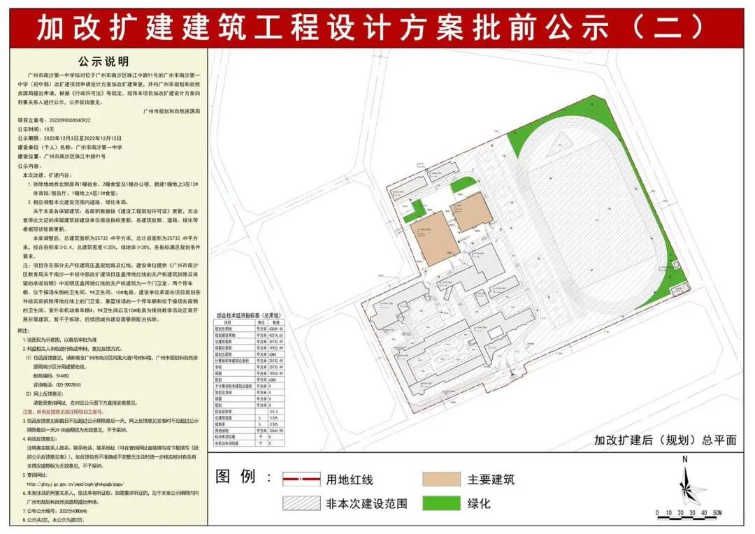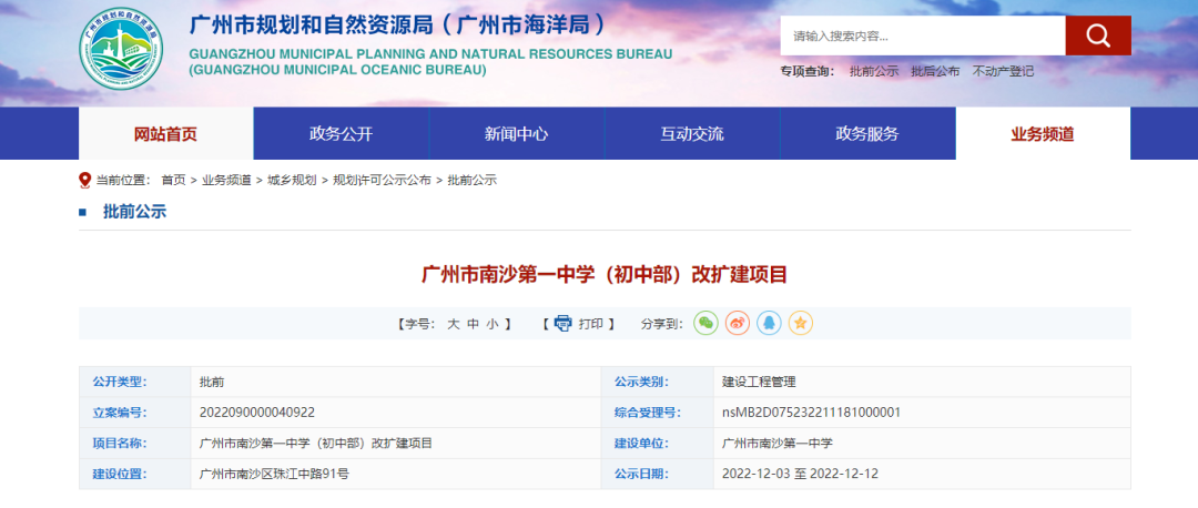 12月3日,广州市规划和自然资源局官网发布关于广州市南沙第一中学(初中部)改扩建项目的批前公示。