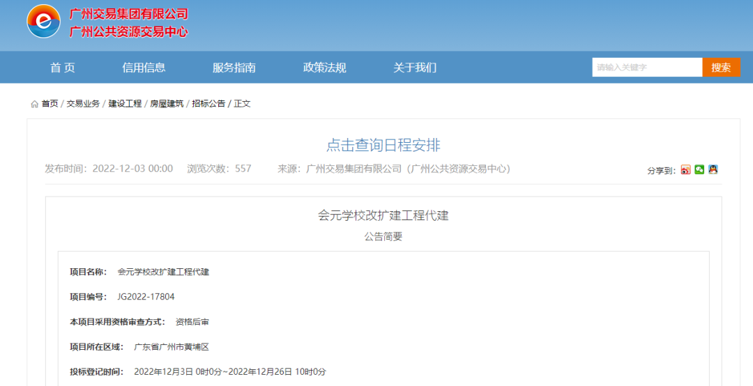 会元学校改扩建12月3日,广州市公共资源交易中心官网发布了关于会元学校改扩建工程代建项目的招标公告。