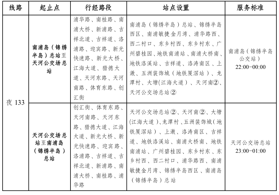 据介绍,新开通的夜133线路,起止站为南浦岛(锦绣半岛)总站至天河公交场总站,营运时间为22:00-次日01:00,其中南浦岛(锦绣半岛)总站从22:00至00:00 发班,天河公交场总站从23:00至次日01:00发班。主要行经浦华路、南桂路、南浦大桥、新浦路、吉祥北道、吉祥道、洛浦路、迎宾路、新光快速路、新光大桥、江海大道、猎德大道、天河东路、天河南路、体育东路、创汇街等,具体线路信息具体如下: