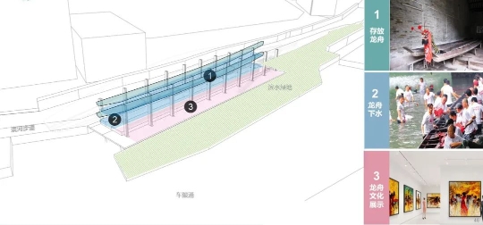 从功能上考虑,架起的观景平台回应了岭南地域的建筑特色,不仅增加了建筑的迎风面,更拓展了人的视觉与感觉上的联系,呼应了车陂涌两岸景观。在用途上,设计方案探索了不同情境下的龙舟利用模式,在满足龙船坞基本功能需求的同时,又兼顾文化民俗宣传等功能。改建部分建立起一种独特的存在感,与周围环境产生怀有尊重的对话,使得龙船坞成为车陂涌上的活力媒触。