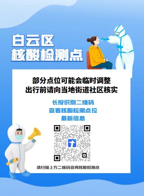 为满足市民朋友核酸检测的需求,白云区在辖内人口密集地、居民聚居区设置了核酸采样点,请市民朋友出行前向当地街道社区核实。