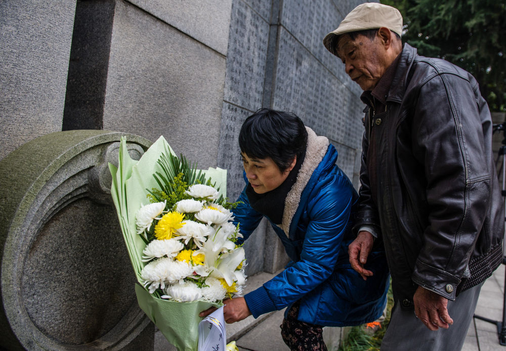 2014年12月7日,南京大屠杀幸存者常志强和女儿常小梅在家祭中向当年遇难的亲人献花。新华社记者 沈鹏 摄