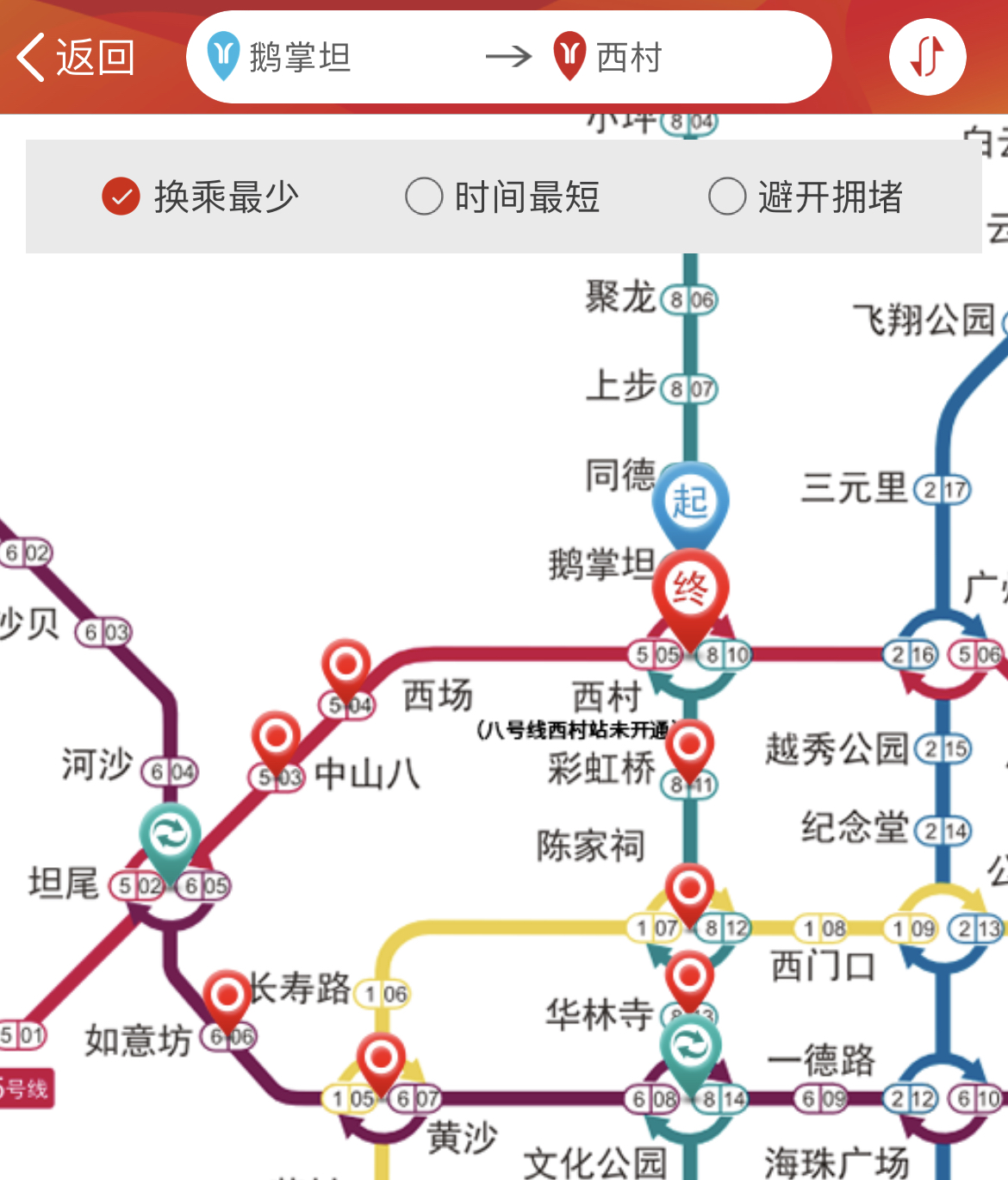 当前,五号线西场站到八号线鹅掌坦站,需要先搭五号线到坦尾换乘六号线,再到文化公园换乘八号线,耗时38分钟,票价4元。未来该段票价降至2元,时间将缩短至大约原来的零头。前后对比最明显的情况是,由八号线鹅掌坦站到五号线西村站,目前需要换乘2次,用时40分钟,票价4元,而未来八号线开通西村站之后,一站直达不需换乘,大约2分钟,票价2元。