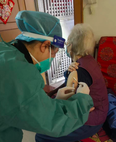 家住东环社区的郝奶奶今年已97岁,行动不便,一直没有接种新冠疫苗。近日,经过社区工作人员的沟通,郝奶奶表示愿意接种疫苗。之后,医护和志愿者按照预约时间上门为老人完成了接种。