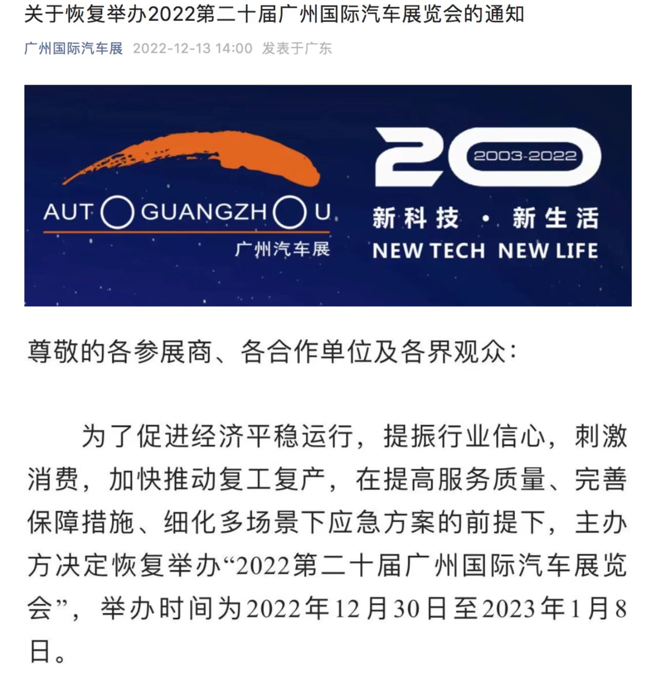 公告指出:为了促进经济平稳运行,提振行业信心,刺激消费,加快推动复工复产,在提高服务质量、完善保障措施、细化多场景下应急方案的前提下,主办方决定恢复举办“2022第二十届广州国际汽车展览会”,举办时间为2022年12月30日至2023年1月8日。