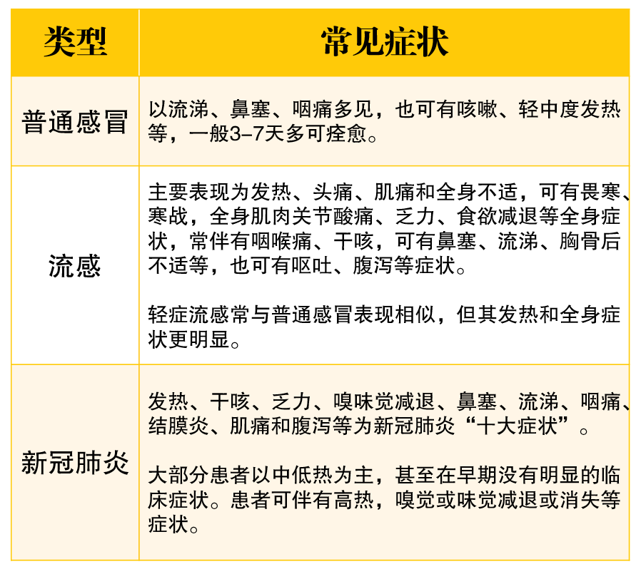 当出现发热、咳嗽、喉咙痛、头痛、鼻塞流涕等症状时,如何分辨自己是普通感冒、流感还是新冠肺炎?有约君整理了一张表,供大家参考。
